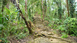 Auch hier kann man nicht in die Sierra Nevada. Die Berge sind heilige Orte fuer die Uhreinwohner. Man kann zur Ciudad perdida laufen, aber nur in grossen Gruppen mit Guide. Da ich im letzten Nationalpark nicht wandern konnte, habe ich das dann trotzdem gemacht. Es waren insgesamt 80 Leute, die gleichzeitig gestartet sind. Echt ein riesen Haufen. Zum Glueck verlaueft es sich dann mit der Zeit etwas. Die Gruppen sind immer so 12 Leute. Meine Gruppe bestand auch nur aus sehr lustigen Gesellen. Es gab auch leckeres veganes Essen fuer mich und wir haben in Haengematten geschlafen. Der Wanderweg ist sehr schoen, alles gruen, nicht sehr anstrengend, v.a., da man kaum was mitnehmen muss. Es hat oefter geregnet, aber das ist ne super Abkuehlung und Regensachen braucht man nur fuer den Rucksack. Die letzte Flussueberquerung vor dem letzten Camp haben wir gerade noch geschafft bevor er sich in einen reisenden Strom verwandelt hat. Sonst war er auch ein wunderbarer, klarer Badefluss.