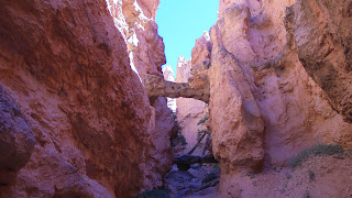 Am naechsten Tag bin ich dann aus dem Canyon rausgewandert. Der Blick von oben in das sogenannte Amphitheater war traumhaft. Die Hoodoos, die Steinfiguren, sehen teilweise aus, als wuerde die Sonne durchscheinen. Das sind die Saeulen, die wie Maennchen aussehen und, da aus etwas haerterem Gestein, nach der Erosion des weicheren Materials stehen geblieben sind. Im groesseren Masstab ist die Landschaft hier wie eine Treppe. Ein Teil davon heisst auch The Grand Staircase-Escalante. Bryce ist der oberflaechlichste Teil, Zion der mittlere und der Grand Canyon der unterste.